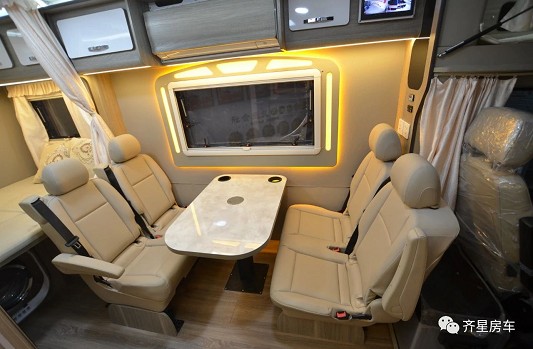 進入車門即入會客區,采用最經典的四人卡座沙發,奔馳威霆汽車座椅乘坐舒適度更高,座椅配有三點式安全帶,對坐沙發中間配置了升降餐桌,降下后可與沙發拼成一張床鋪。
