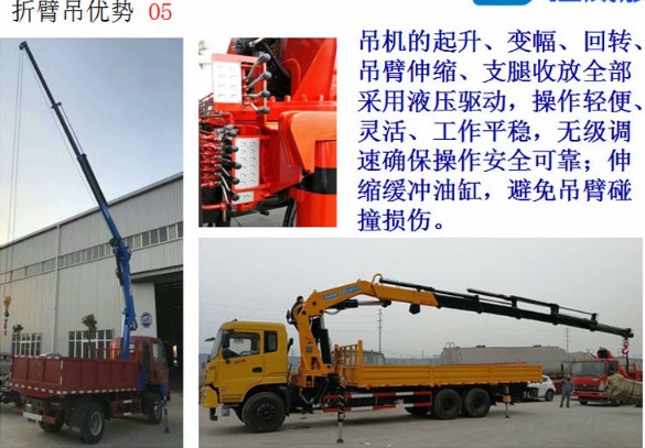 折臂吊優勢05:吊機的起升、變幅、回轉、吊臂伸縮、支腿收放全部采用液壓驅動,操作輕便、靈活、工作平穩,無級調速確保操作安全可靠;伸縮緩沖油缸,避免吊臂碰撞損傷。